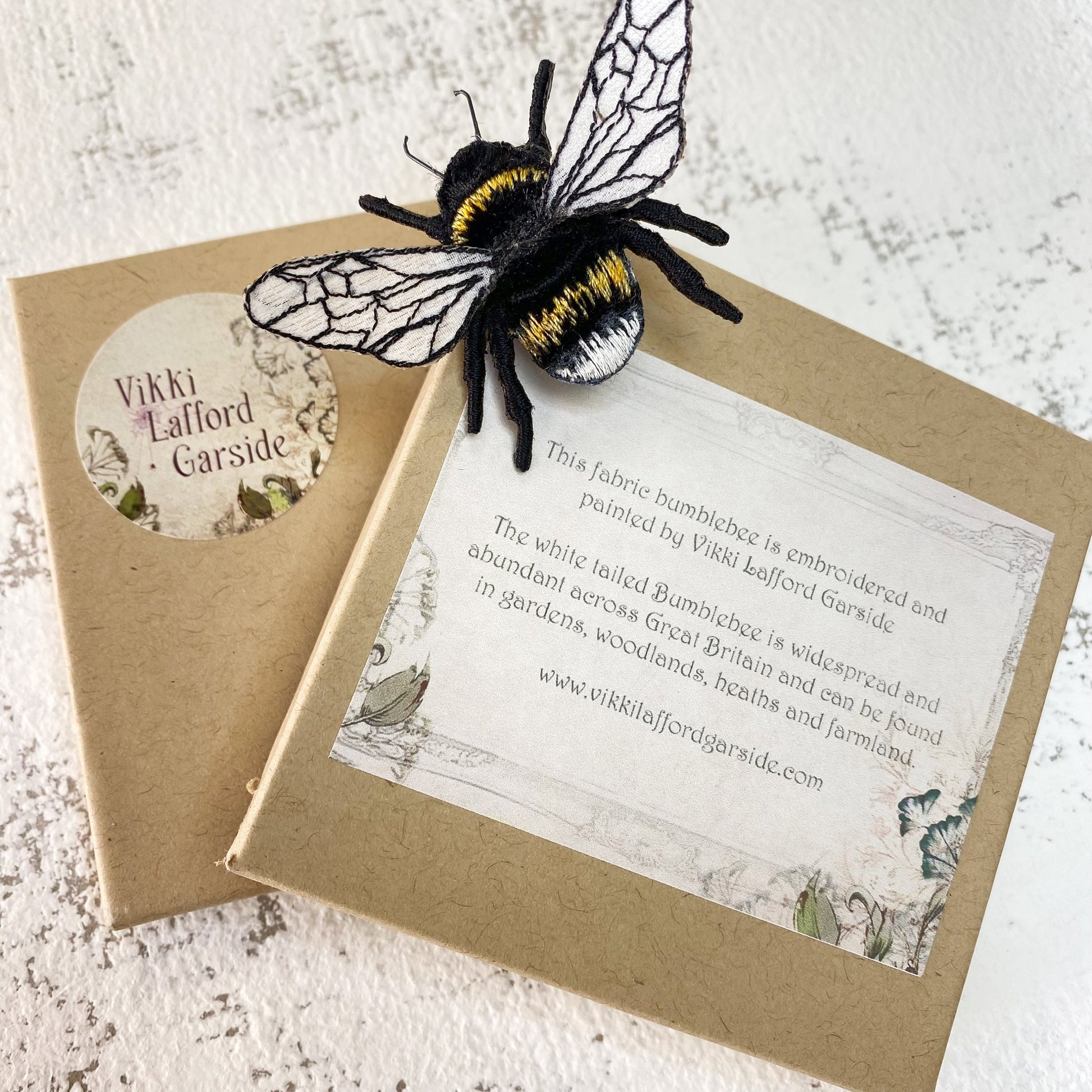 The intricate detail of this fascinating insect is captured in this brooch. The natural mellow colors of this insect naturaully blend into any style. This beautiful embroidered and hand-painted brooch closely resembles the real thing and is a unique additional to any outfit. The brooch is crafted in black faux suede and velvet and embroidered and painted in yellow and white to create the real life texture of the White Tailed Bumblebee.