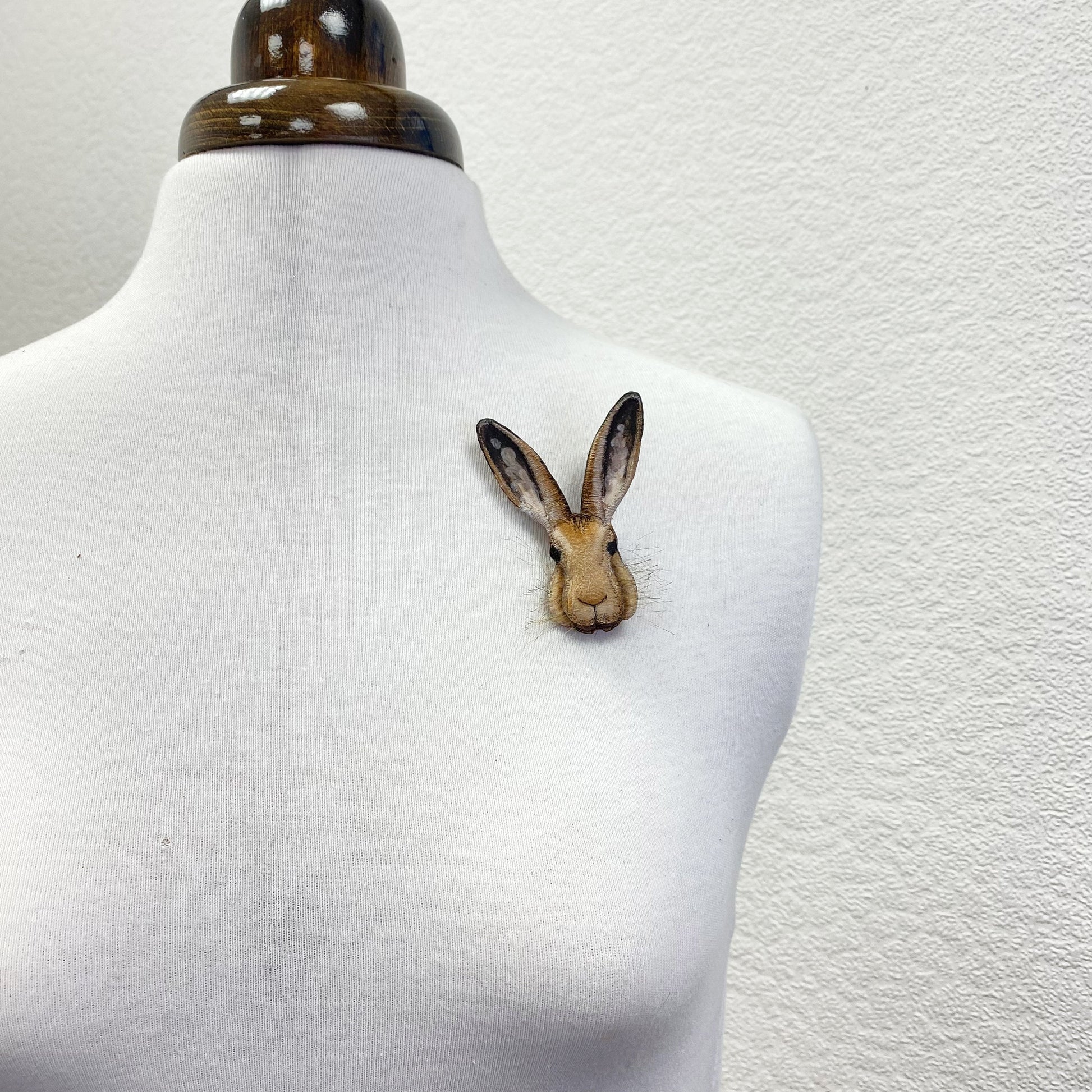 Embroidered and hand painted hare brooch