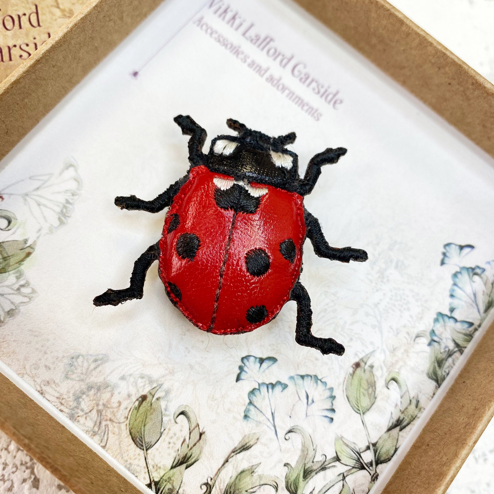 The ladybird brooch is 4cm wide by 4.5cm high. It is presented in a sturdy gift box.