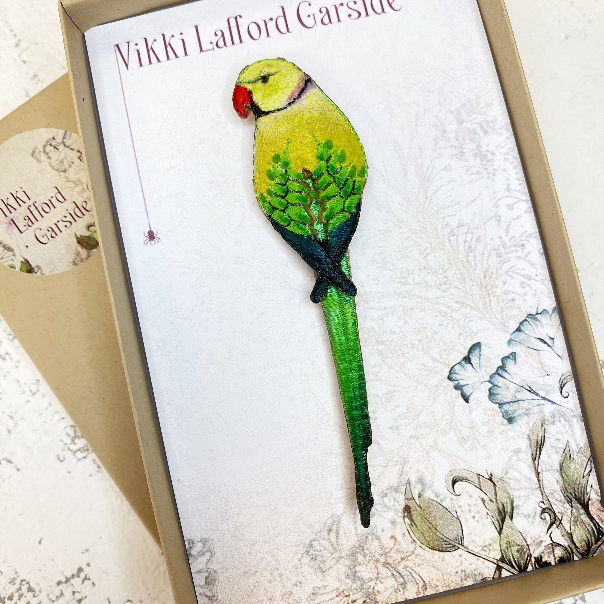 Ring-necked Parakeet brooch, embroidered and hand painted green bird brooch