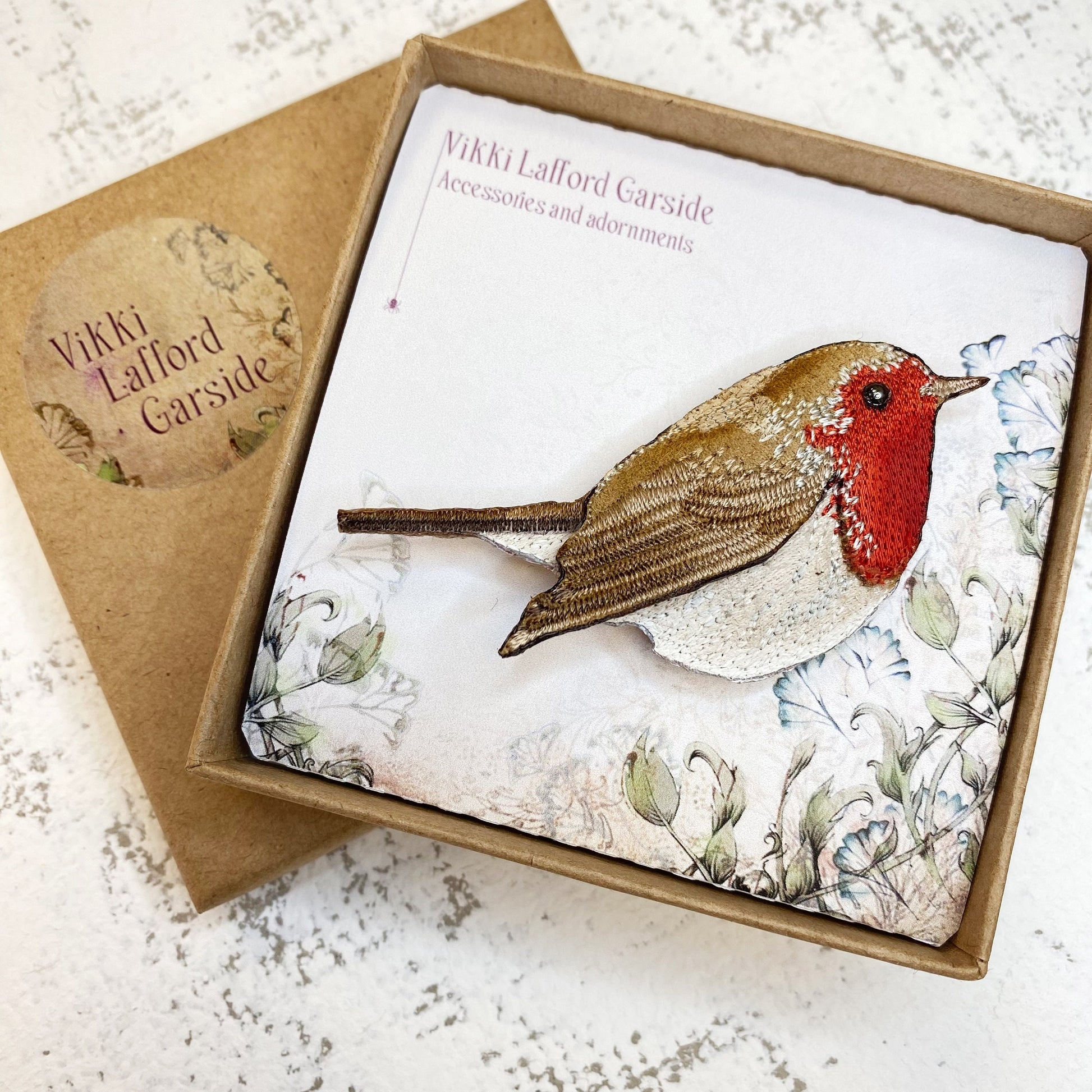 This Robin brooch is created from many layers of fabrics that are embroidered and painted to create a three-dimensional effect. The reverse is backed with soft felt and the edges are sealed so that the fabric does not fray. The brooch is lightweight, soft, flexible and fairly robust so very easy to wear on any garment.